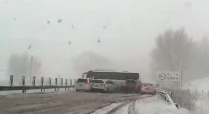据现场视频画面显示,珲乌高速上突降大雪,众多私家车连环追尾挤成一团,多名驾驶员连忙从车内撤出往路边避险。另一段视频画面显示,由于下雪路滑,一辆大巴车纵向停在高速路上,后续多辆私家车由于躲闪不及,撞上了大巴车的侧面。