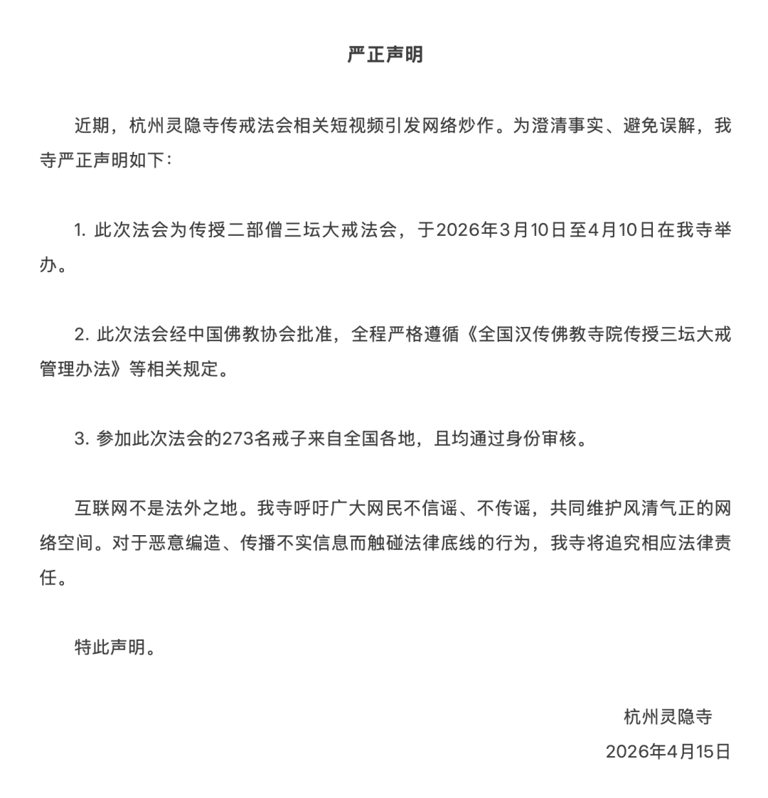 4月15日,杭州灵隐寺发布《严正声明》,回应近期网络上关于该寺传戒法会的相关争议。